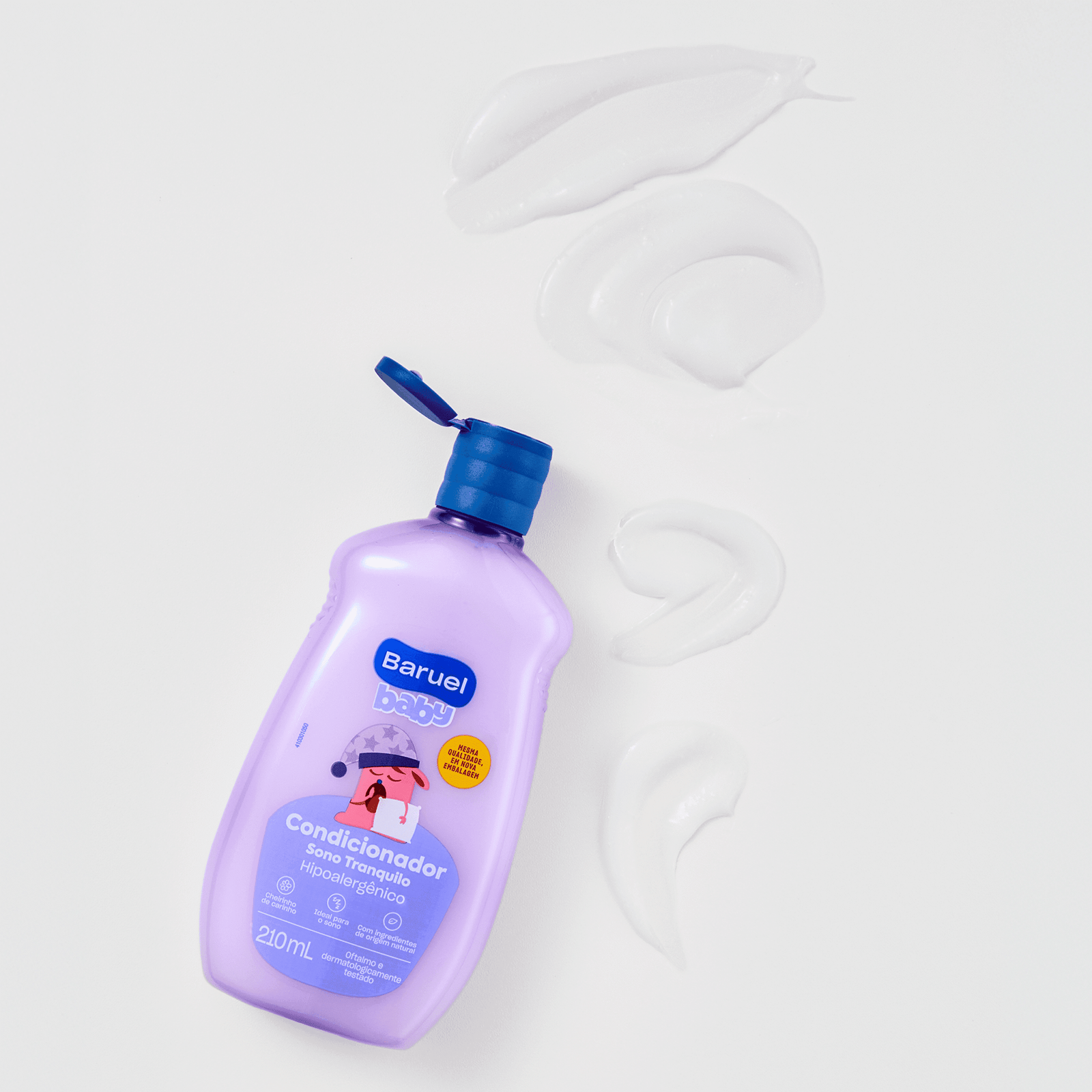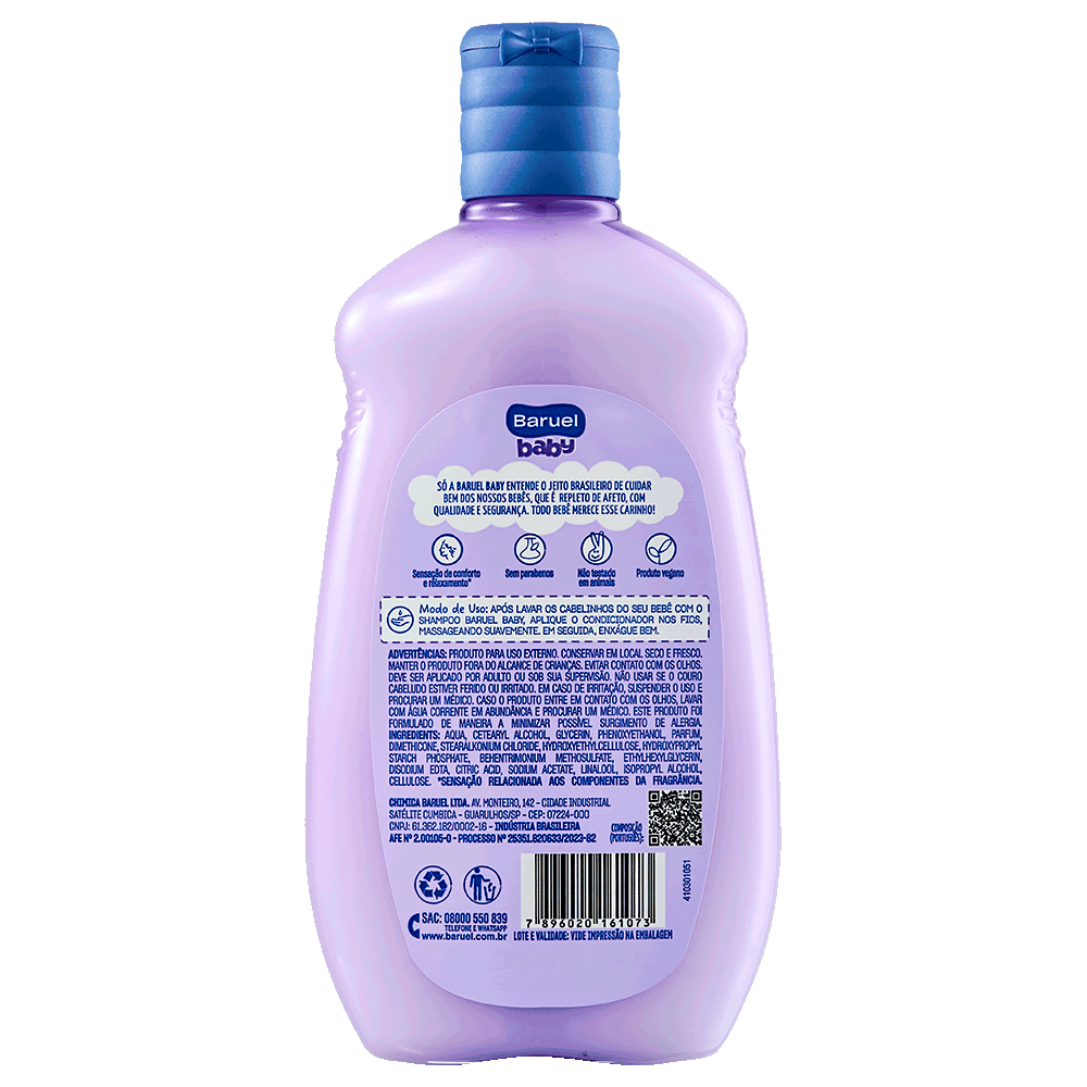 O Condicionador Sono Tranquilo Baruel Baby foi elaborado com ingredientes de origem natural para o cuidado e a hidratação dos cabelos de bebês e crianças. A fragrância é suave e contém notas de lavanda, que ajudam o bebê a acalmar, proporcionando uma agradável sensação de conforto e relaxamento*.