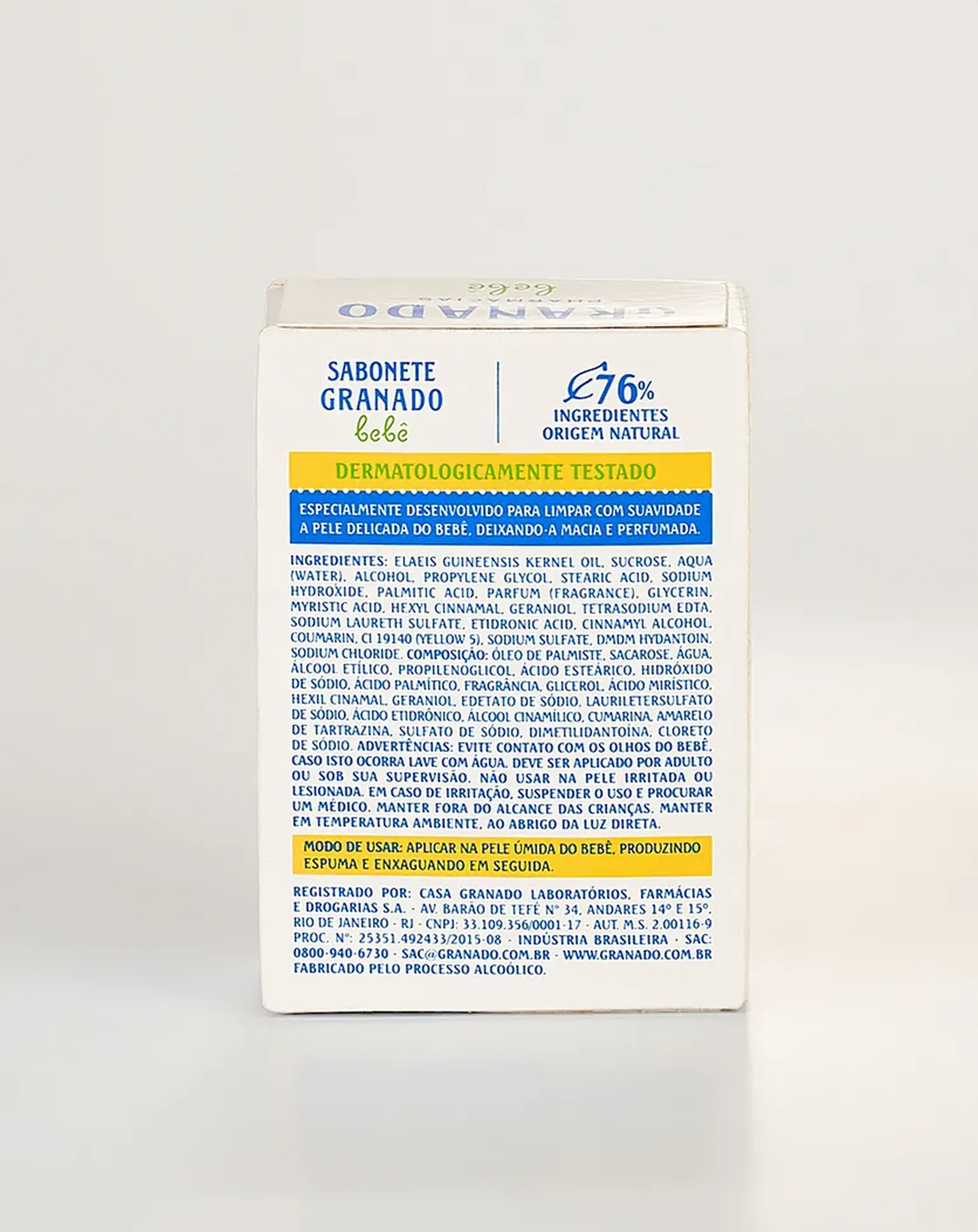 Formulado com glicerina vegetal, o sabonete limpa com suavidade a pele do bebê, deixando-a macia e perfumada. Especialmente desenvolvido para a pele delicada do bebê. Dermatologicamente testado. Livre de conservantes e ingredientes de origem animal.