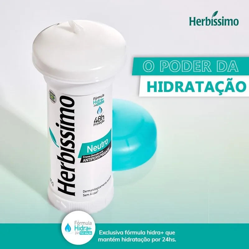 Com uma nova embalagem prática, o Desodorante Twist Antitranspirante Neutro Herbíssimo foi desenvolvido para facilitar o uso no dia a dia, permitindo que você aplique o produto sem precisar usar as mãos. Este creme evita o ressecamento da pele e ajuda a mantê-la macia e hidratada, minimizando possíveis irritações. Oferece 48 horas de proteção contra a transpiração e o odor, sendo dermatologicamente testado e livre de álcool etílico e corantes.
