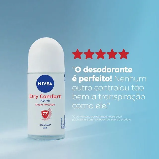 NIVEA Desodorante Antitranspirante Roll-On Dry Comfort é um desodorante desenvolvido para oferecer proteção duradoura contra o suor e mau odor. Ele garante sensação de pele seca por até 72 horas, além de ser dermatologicamente testado para oferecer conforto e cuidado para a pele.