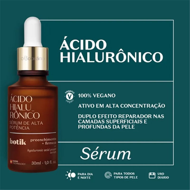 O Sérum de Alta Potência Ácido Hialurônico Botik possui fórmula com alta concentração de ácido hialurônico puro permitindo que o produto tenha um duplo efeito reparador ao penetrar nas camadas superficiais e profundas da pele, reduzindo rugas e diminuindo a flacidez com resultados visíveis em 30 dias de uso! Preenchimento e redução de linhas de expressão com alto poder de hidratação.