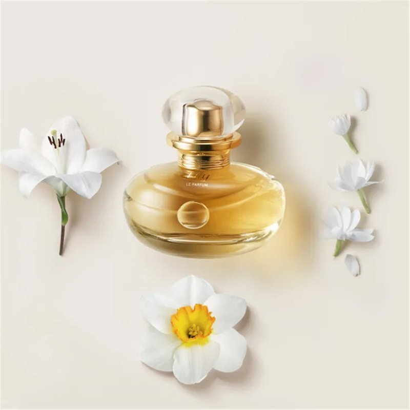 O frasco de Lily possui tampa em formato arredondado, é transparente e feita com Surlyn, um material plástico reciclado que obtemos de tampas coletadas nas nossas fábricas e programas de reciclagem. A válvula do frasco, por onde a fragrância é borrifada, é de metal e dourada. Na cor transparente, o frasco é de vidro e tem as bordas arredondas. Ele conta com linhas em relevo na parte superior que remetem a uma fluidez delicada. Entre as linhas está escrito Lily Eau de Parfum. A fragrância, por sua vez, possui um tom de amarelo que enriquece o produto como um todo.